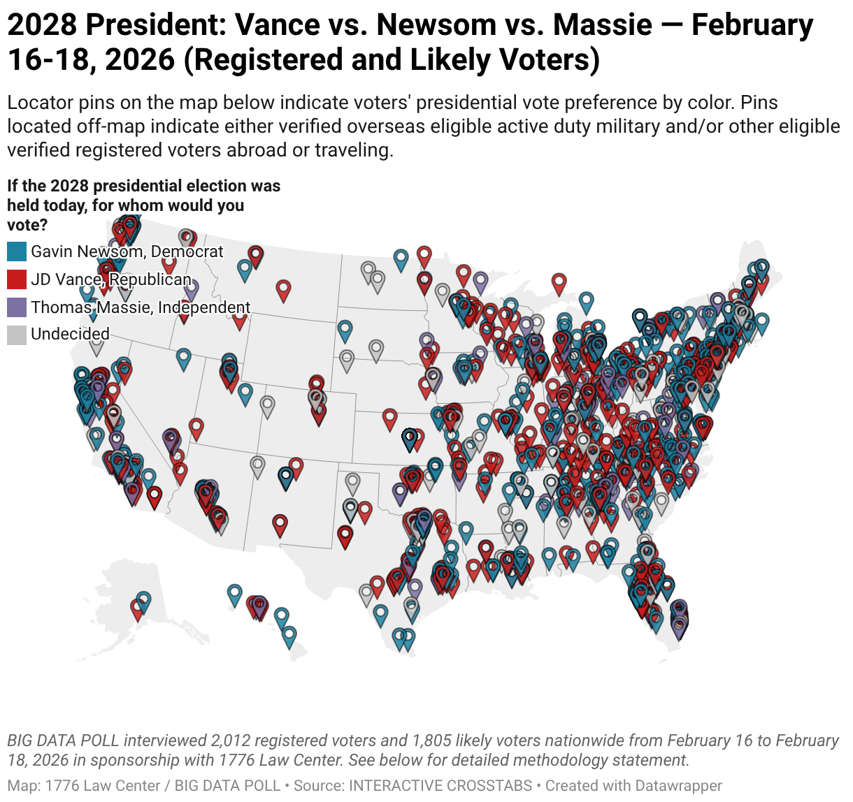 The Public Polling Project conducted by BIG DATA POLL interviewed 2,012 registered voters and 1,805 likely voters nationwide from February 16 to February 18, 2026. Interviews conducted online are sourced through Lucid (CINT) and live-agent phone interviews including P2P SMS and text-to-online are sourced from the L2 National Voter File Database. Participants who opted for text-to-online were given 24 hours to complete the interview. Interview details plotted on maps can be reviewed by hovering and clicking on the locator pins. Results were weighted for sex, age, race and ethnicity, education, and geography. The overall sampling error is ±2.1% for the registered voter sample and ±2.3% for the likely voter sample at a 95% confidence level. It is important to note that sampling errors for subgroups are higher. All BIG DATA POLL publicly conducted surveys are crowdfunded via the Public Polling Project, supplemented if necessary by BIG DATA POLL and are NOT funded by or affiliated with any candidate, campaign, committee, or political entity. This survey was conducted with partner sponsorship from 1776 Law Center. Full and interactive crosstabs can be viewed on MarketSight. The Four Freedoms Poll is an annual partnership with the Public Polling Project sponsored by 1776 Law Center to gauge support and/or opposition to issues relating to food, financial, medical and political freedoms. 1776 Law Center helps those who cannot afford counsel and public advocates to obtain capable, competent counsel and public advocates, especially when their case broadly impacts civil liberties.