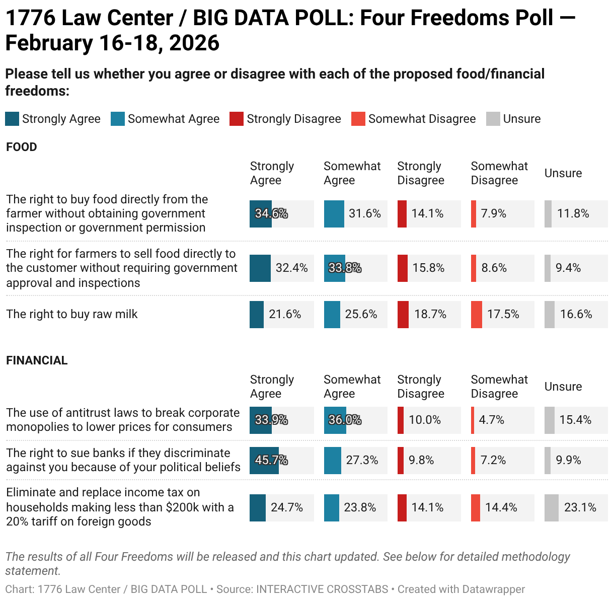 The Public Polling Project conducted by BIG DATA POLL interviewed 2,012 registered voters and 1,805 likely voters nationwide from February 16 to February 18, 2026. Interviews conducted online are sourced through Lucid (CINT) and live-agent phone interviews including P2P SMS and text-to-online are sourced from the L2 National Voter File Database. Participants who opted for text-to-online were given 24 hours to complete the interview. Interview details plotted on maps can be reviewed by hovering and clicking on the locator pins. Results were weighted for sex, age, race and ethnicity, education, and geography. The overall sampling error is ±2.1% for the registered voter sample and ±2.3% for the likely voter sample at a 95% confidence level. It is important to note that sampling errors for subgroups are higher. All BIG DATA POLL publicly conducted surveys are crowdfunded via the Public Polling Project, supplemented if necessary by BIG DATA POLL and are NOT funded by or affiliated with any candidate, campaign, committee, or political entity. This survey was conducted with partner sponsorship from 1776 Law Center. Full and interactive crosstabs can be viewed on MarketSight. The Four Freedoms Poll is an annual partnership with the Public Polling Project sponsored by 1776 Law Center to gauge support and/or opposition to issues relating to food, financial, medical and political freedoms. 1776 Law Center helps those who cannot afford counsel and public advocates to obtain capable, competent counsel and public advocates, especially when their case broadly impacts civil liberties.